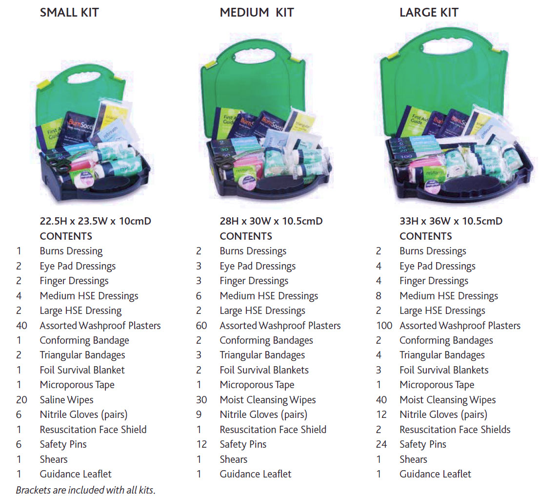 The only official UK standard for first aid kit contents is the British Standard BS8599-1. The HSE provides some guidance on the type of items that should be in a first aid kit, but not the quantities. The old BHTA standard kit 10, 20 and 50 (often called HSE kits), are now obsolete and withdrawn. The British Standard BS8599-1 Compliant kits, now provide employers with a means by which they can choose a kit that matches their risk needs assessment, while still demonstrating compliance with the spirit of the legislation. Some employers may have diverse or unusual situations and will need to make bespoke provision for such risks, these situations however, are not likely to be typical. The BS8599-1 compliant first aid kits will be suitable for most situations.